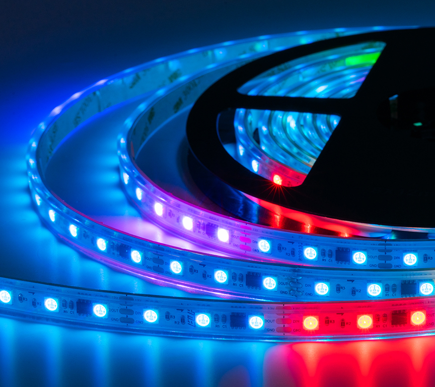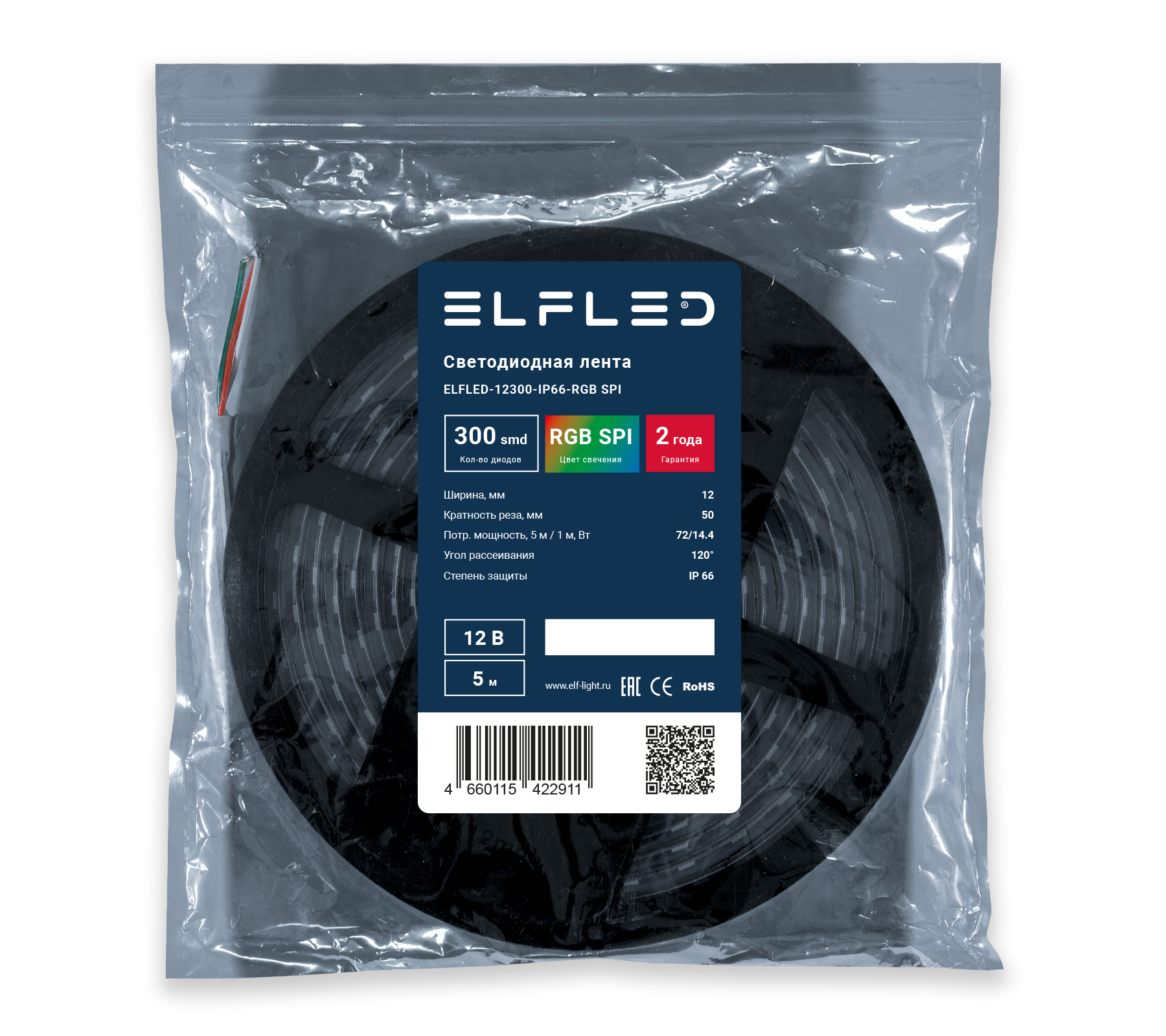 - Лента светодиодная герметичная ELFLED 300SMD, 12В, IP66, 5м, RGB SPI WS2811