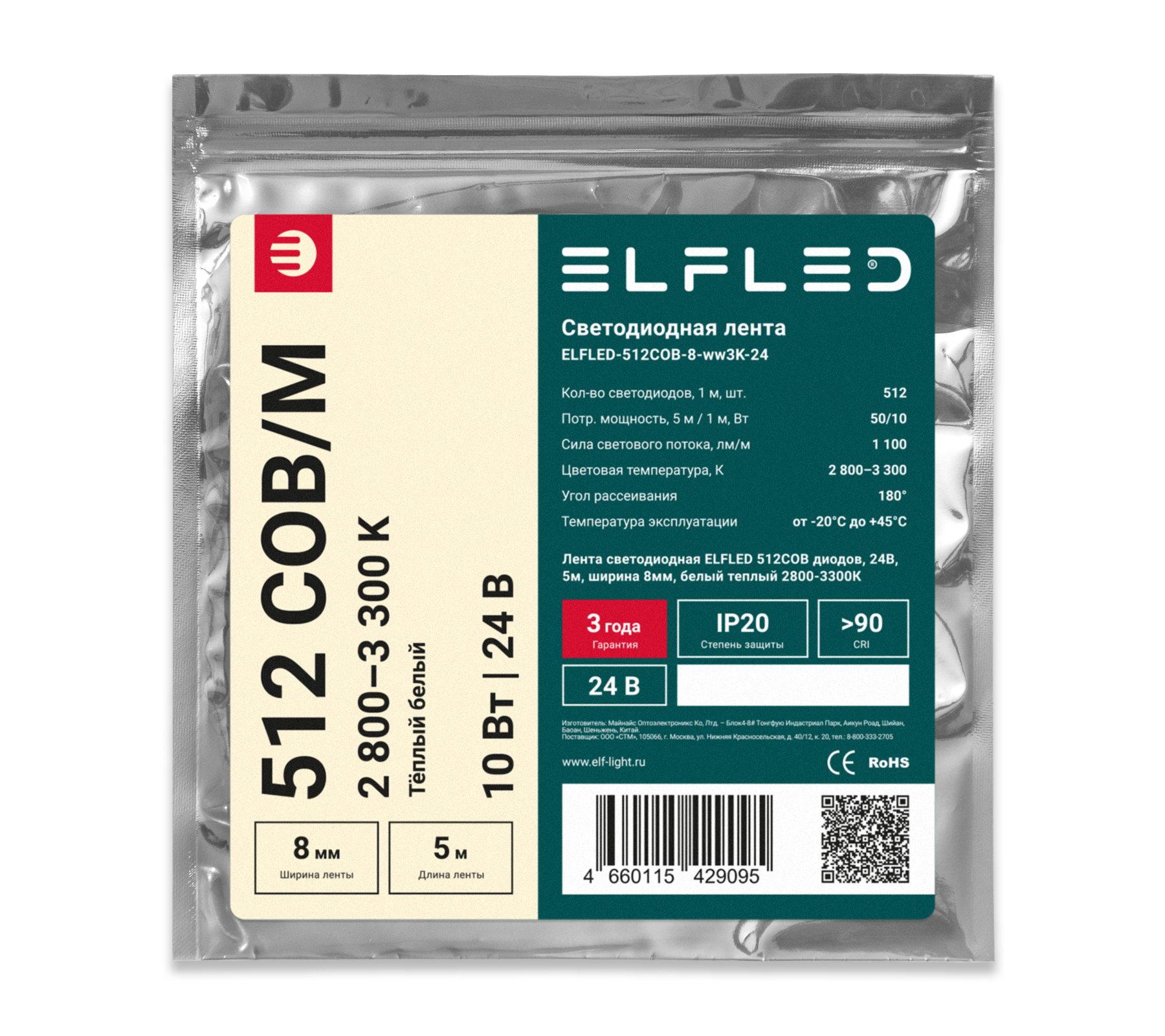 - Лента светодиодная ELFLED 512COB диодов, 24В, 5м, ширина 8мм, белый теплый 2800-3300К