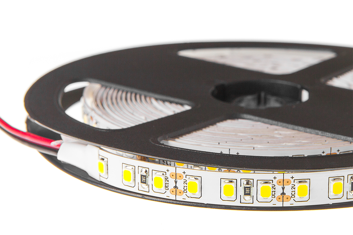 Светодиодная лента представляет собой шлейф из 600 SMD-диодов типа 2835, которые отличаются высокой яркостью и низким энергопотреблением. На гибкой плате длиной 5000 мм и шириной 8 мм плотность расположения диодов составляет 120 шт. на метр.