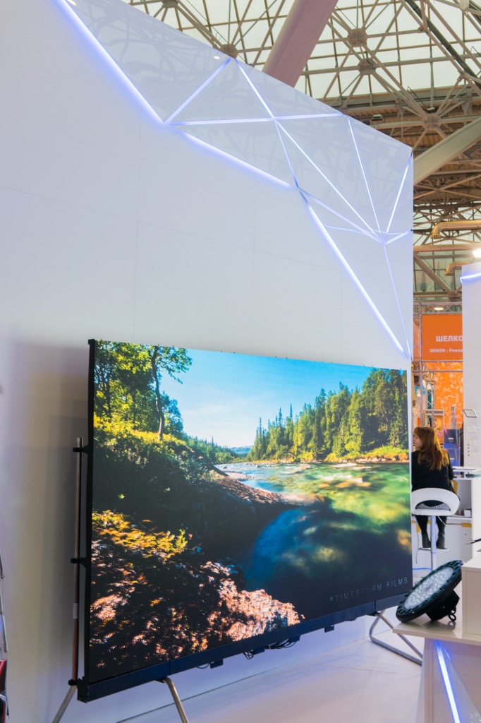 Особое внимание заслужили светодиодные медиа-экраны. 2 совершенно новых экрана с шагом пикселя 1.6 и 1.4 мм. поражали посетителей выставки чёткостью картинки, а профессионалы особенно отмечали качество сборки.