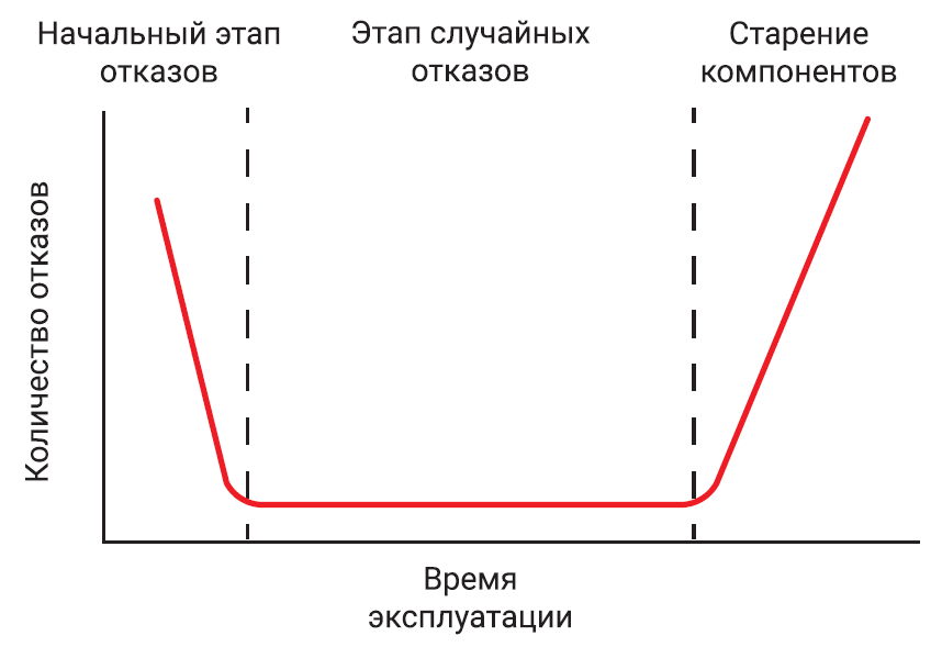 Как правило, количество отказов блока питания в зависимости от срока эксплуатации можно представить в виде графика. Где можно выделить три периода. Дли того, чтобы исключить первый период все блоки ELF проходят тестирование в критических условиях на заводе, чтобы отобрать неисправные изделия и не допустить их попадание клиентам. В итоге блоки питания находятся на этапе случайных отказов, где процент выхода очень низок и определяется качеством электричества, соблюдением правил монтажа, температурой перегрева. После этого периода наступает период более частых выходов из строя, которые происходят в следствии деградации компонентов: износ электролитического конденсатора (диффузия электролита), снижение яркости светодиода в оптопаре и т.д. Светодиодный БП постоянно взаимодействует с внешней средой. Существуют множество тонкостей, которые определяют то, как он это делает. Схемотехника, технология сборки, элементная база, условия эксплуатации, соблюдение правил монтажа - от всех этих свойств зависят большое количество рисков и проблем, возникающих в процессе работы. Как пример, можно взять микросекундные импульсы большой энергии, которые чаще всего связаны с попадание грозовых разрядов в сеть, или из-за влияния переходных коммутационных процессов, возникающих при включении нагрузок в сеть (системы кондиционирования, холодильные установки, вентиляция и т.д.). В хороших БП есть защита на входе от скачков входного напряжения. Но необходимо понимать, что у этой защиты ограниченное количество срабатываний (30-50 раз), да и сам скачок может превысить характеристики установленного на входе защитного элемента (варистора). Для решения этой задачи вы можете использовать внешнее устройство защиты. Либо использовать БП питания с максимально широким диапазоном напряжений.
